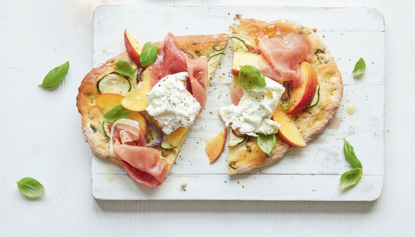 Courgette flatbreads with ham, peaches and burrata